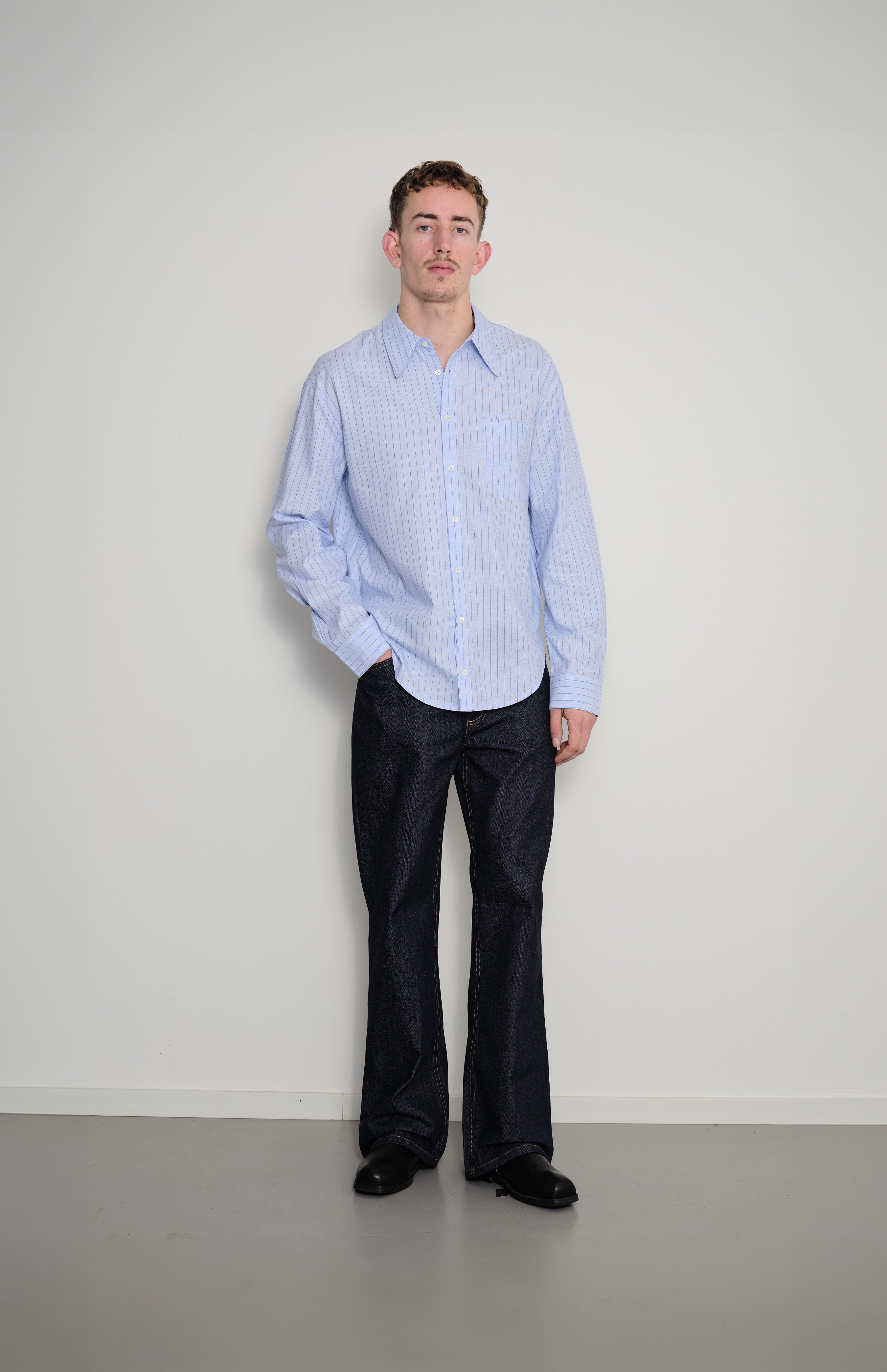 The blue pinstripe cropped shirt of Pinkorange is a timeless high-quality piece. The shirt has a regular fit with cropped back and is designed so you can wear it for years and years.
