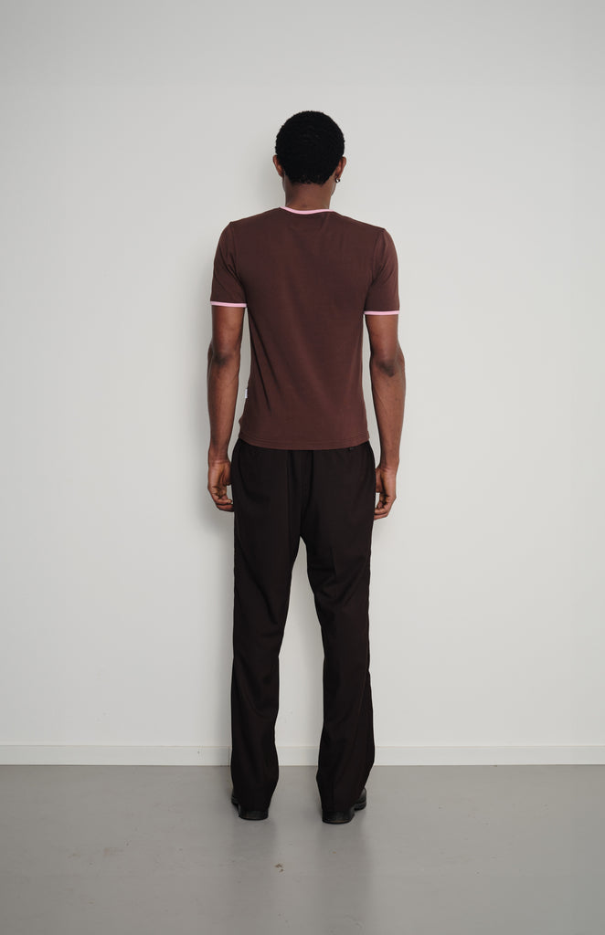 The brown fitted ringer t-shirt of Pinkorange is a timeless high-quality piece. The ringer t-shirt has a slim fit and is designed so you can wear it for years and years.